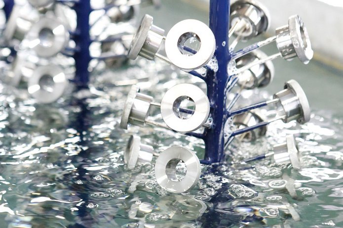 In unseren leistungsfähigen, computergesteuerten Galvanikanlagen können wir Schüttgut im Trommelverfahren vernickeln. Anspruchsvolle Teile werden mit verschiedenen Oberflächenstrukturen am Gestell vernickelt, verchromt oder in Velours-Optik ausgeführt. Für einen intensiveren Korrosionsschutz empfehlen wir, die Teile zu passivieren.